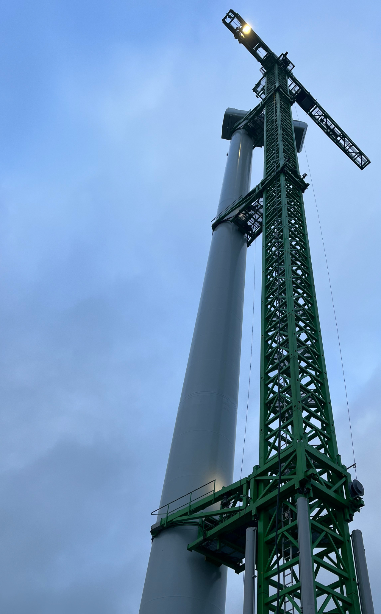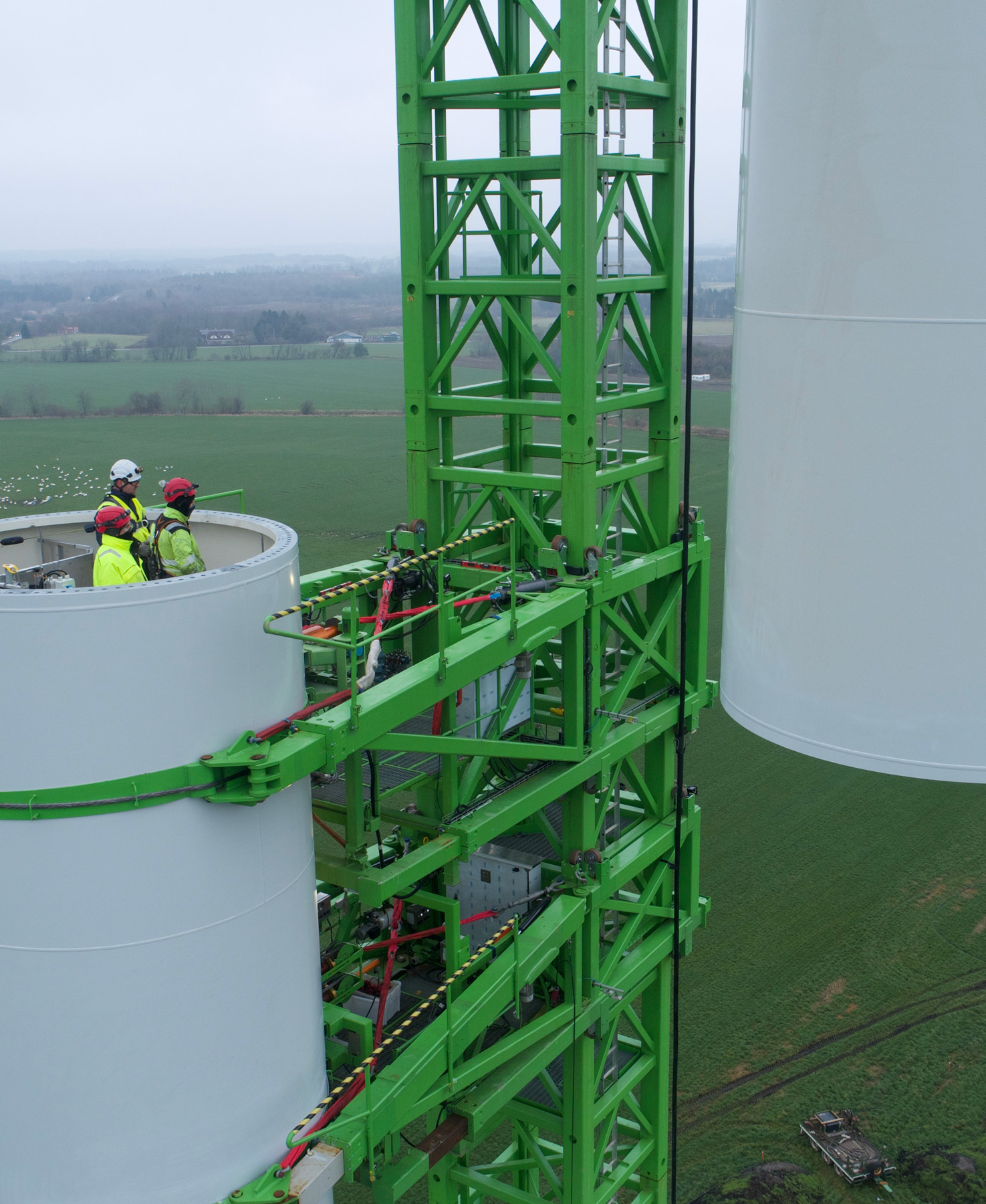 We have developed a unique technology to build wind turbines and they can now be made taller and more powerful than anyone thought possible. The crane is erected gradually in segments from the bottom up, while it clings to the tower being built. This means that the crane is scalable and can lift both higher and heavier in a much shorter time, while substantially reducing cost and environmental impact.